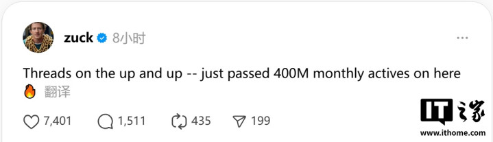 IT之家援引博文介绍,Meta于今年1月披露的数据,2024年年底Threads月活跃用户为3.2亿;2025年4月30日的财报电话会,官方披露Threads的月活跃用户为3.5亿,而最新数据达到了4亿。